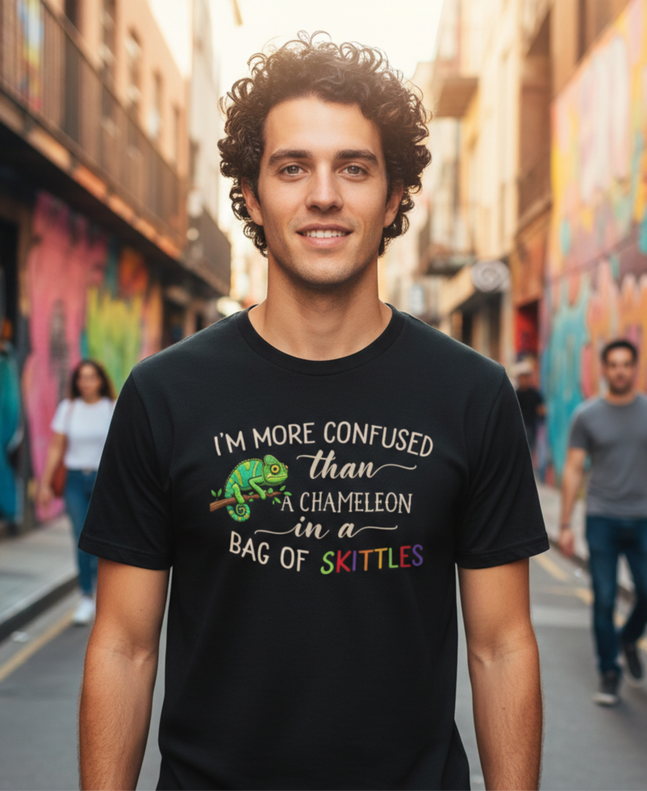 Oversized graphic t shirt designed for bold street style, comfort, and personality. Featuring a playful confused chameleon illustration with a witty quote, this tee brings humor into everyday wear without trying too hard.